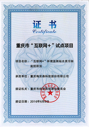2016年6月6日,我司自主研發(fā)“環(huán)境監(jiān)測站水質(zhì)污染監(jiān)控防治項目”納入重慶市“互聯(lián)網(wǎng)+”試點項目,并榮獲重慶市經(jīng)濟和信息化委員會頒發(fā)的證書。該項目采用遠(yuǎn)程收集APP、Web服務(wù)等智能運維方式,減少人工無效服務(wù),幫助污水處理企業(yè)降低人力運營成本。