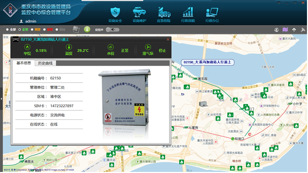 | 重慶市市政綜合管理平臺建立后,已初步對設(shè)施及下屬設(shè)備實(shí)現(xiàn)信息化管理,建立系統(tǒng)如下: 1. 下水道易燃易爆氣體監(jiān)測系統(tǒng),對383處監(jiān)控點(diǎn)進(jìn)行了甲烷濃度、液位狀態(tài)等數(shù)據(jù)實(shí)時(shí)監(jiān)測; |